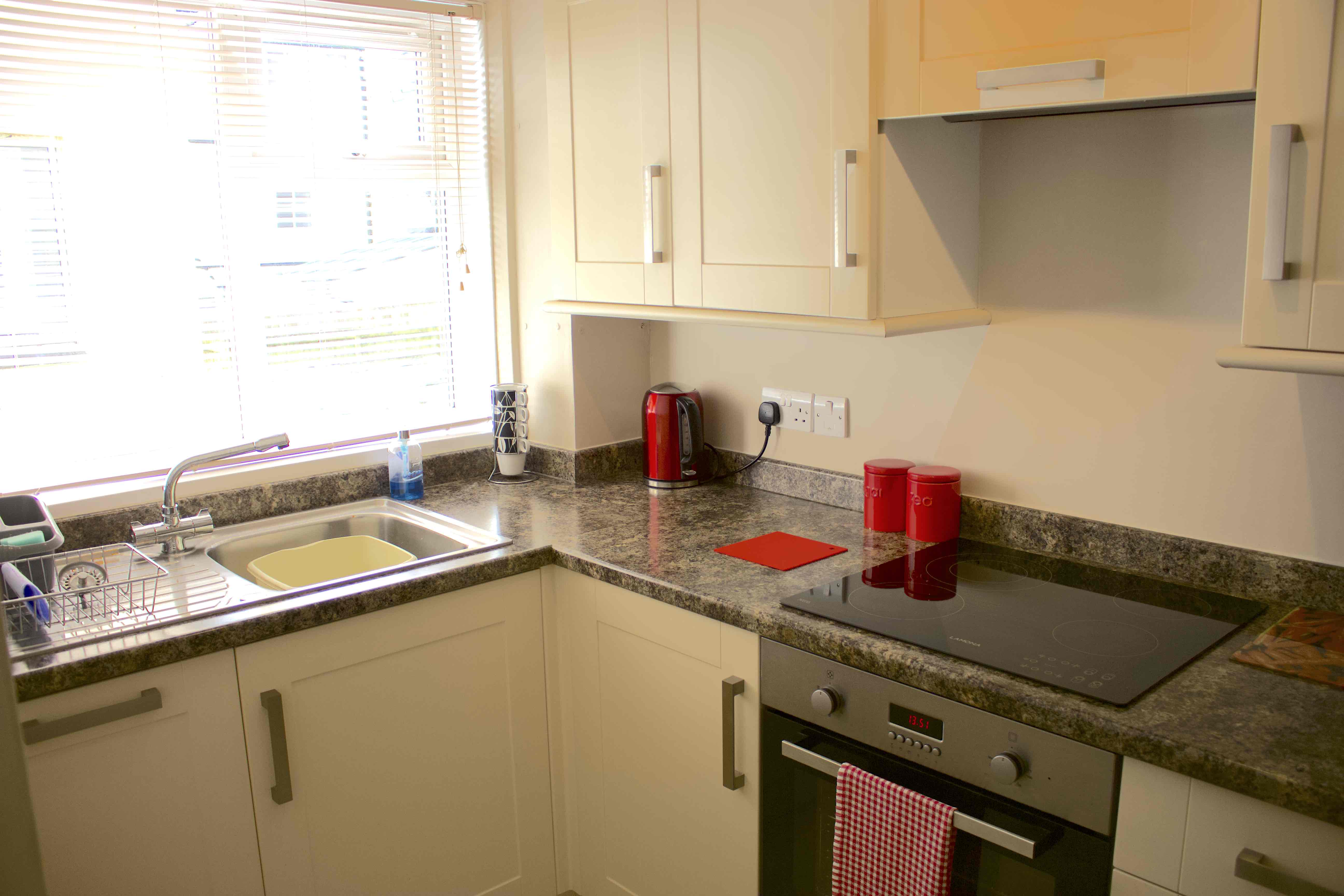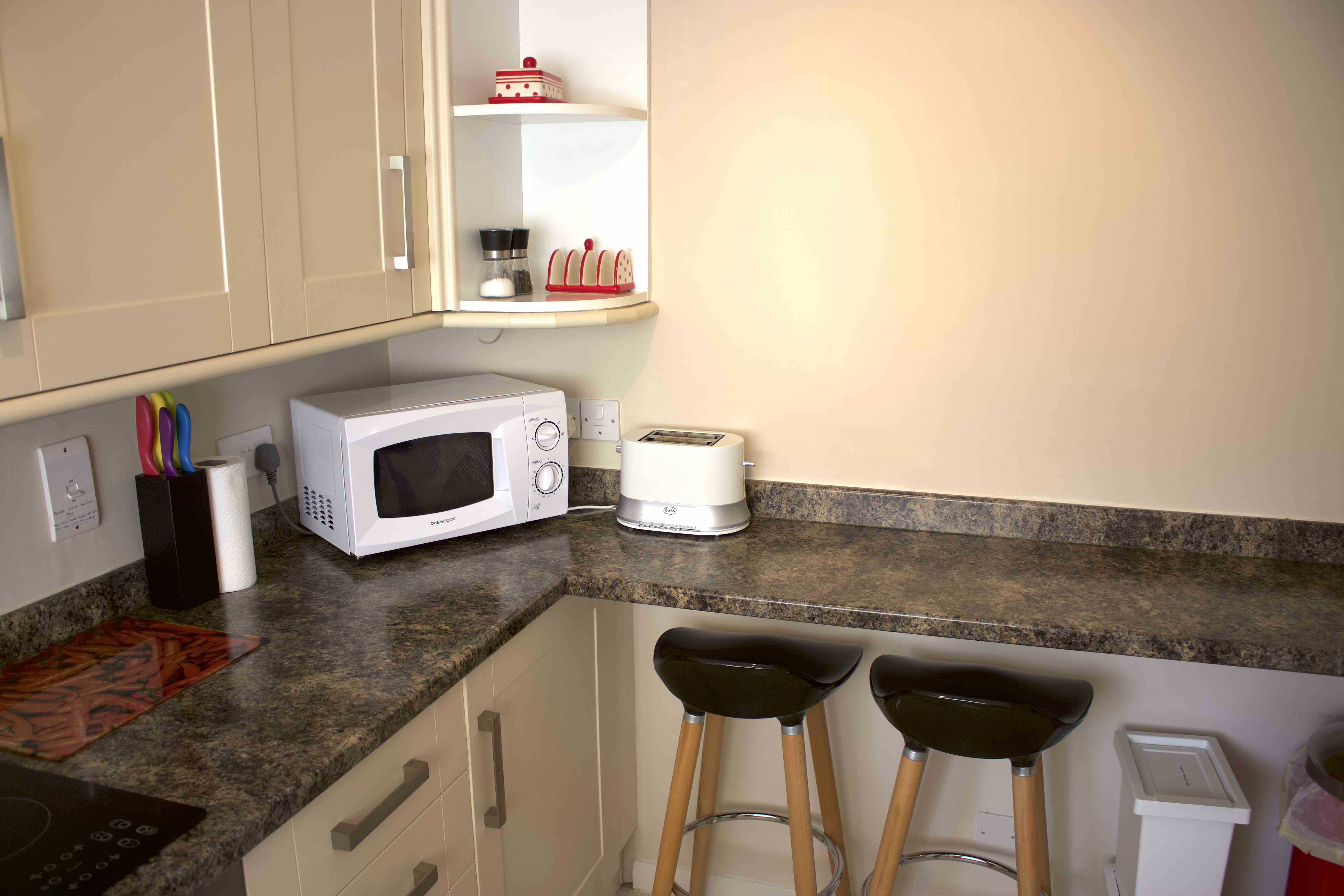 Fully equipped modern kitchen, built-in cupboards with breakfast bar and two stools. Dishwasher, microwave, ceramic hob, fridge/freezer. Tea and coffee provided.