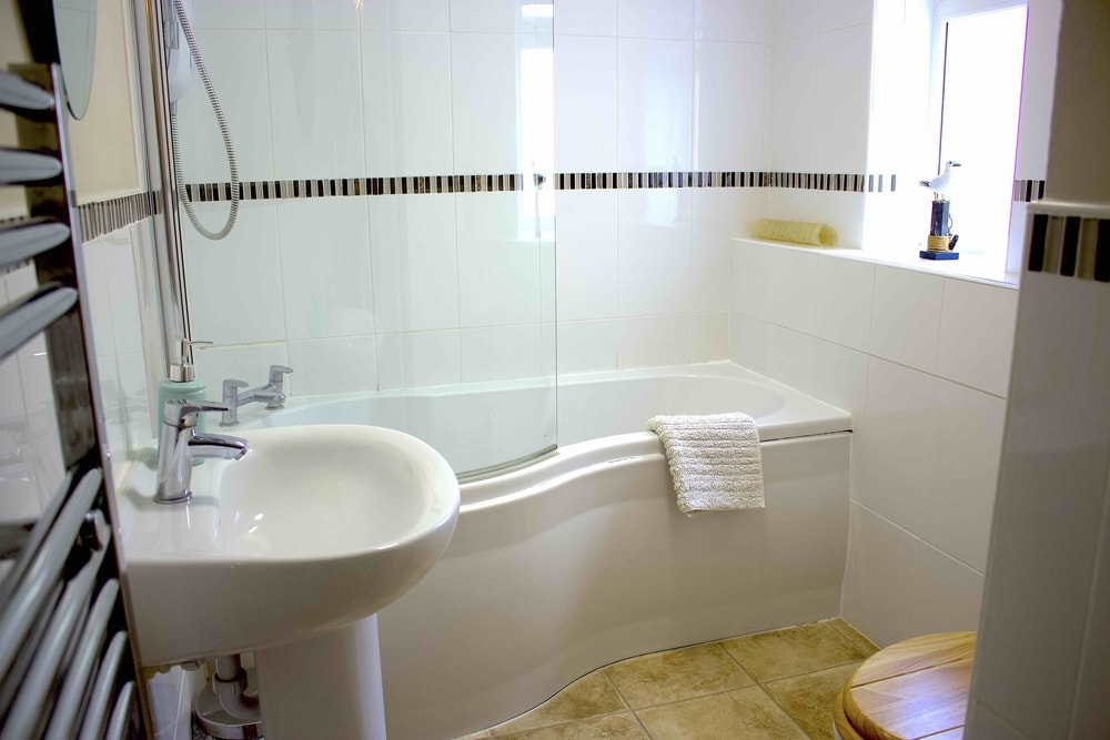 Modern white bathroom, tiled throughout, with shower over bath, hand basin, WC, extractor fan and heated towel rail.
